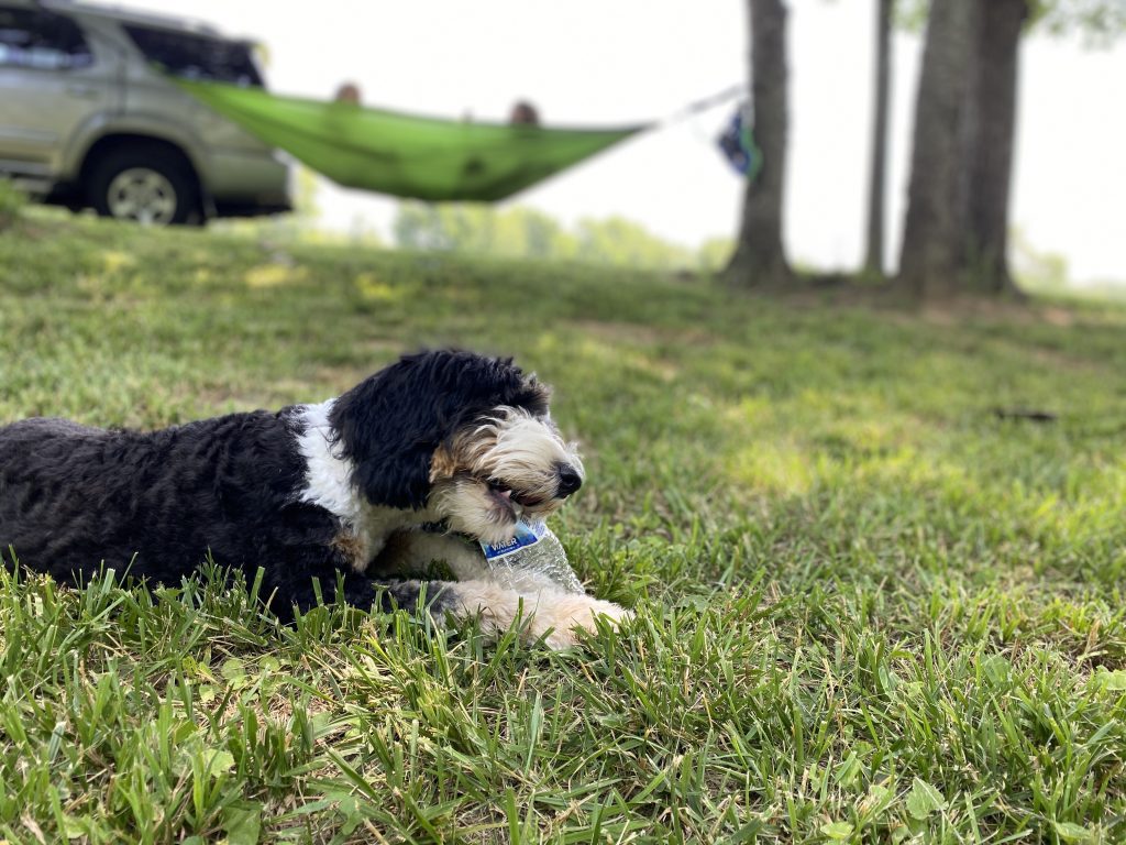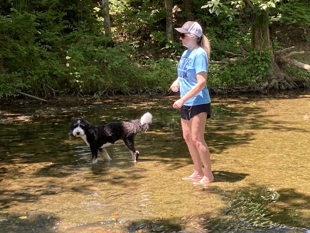 Headed down to the creek for some good times. Let the dog off the lead and she ran for 15 min through the creek and all around. sifted through minnows and dead crayfish. played badminton, horseshoes, and hammock.
